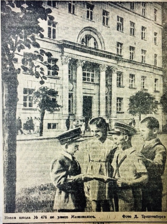 Фотографию, названную «Новая школа №  476 по улице Маяковского», в газете «Ленинградская правда» в 1955 году опубликовал советский художник, фотокорреспондент Давид Михайлович Трахтенберг (1906-1975). В годы Великой Отечественной войны он вёл подробную фотолетопись блокады Ленинграда.